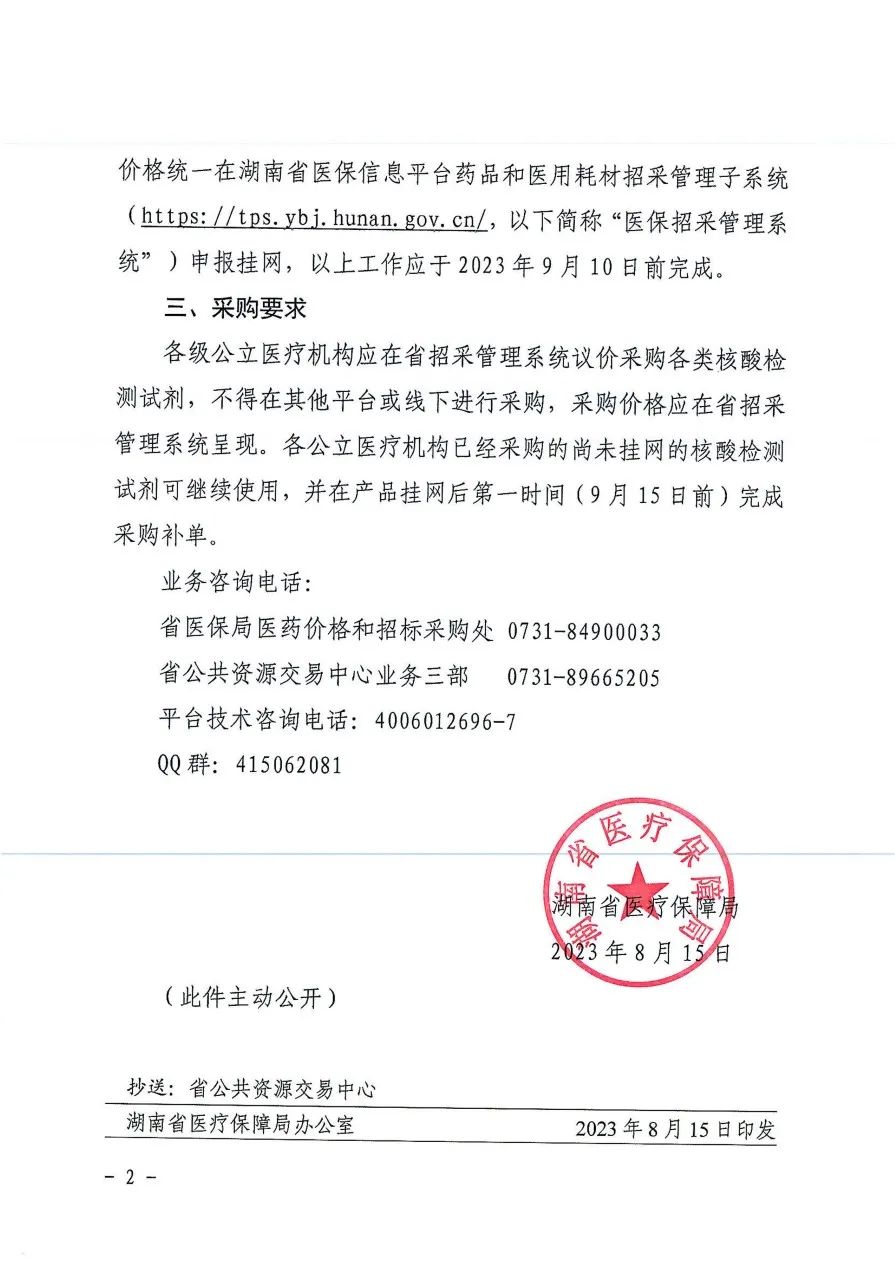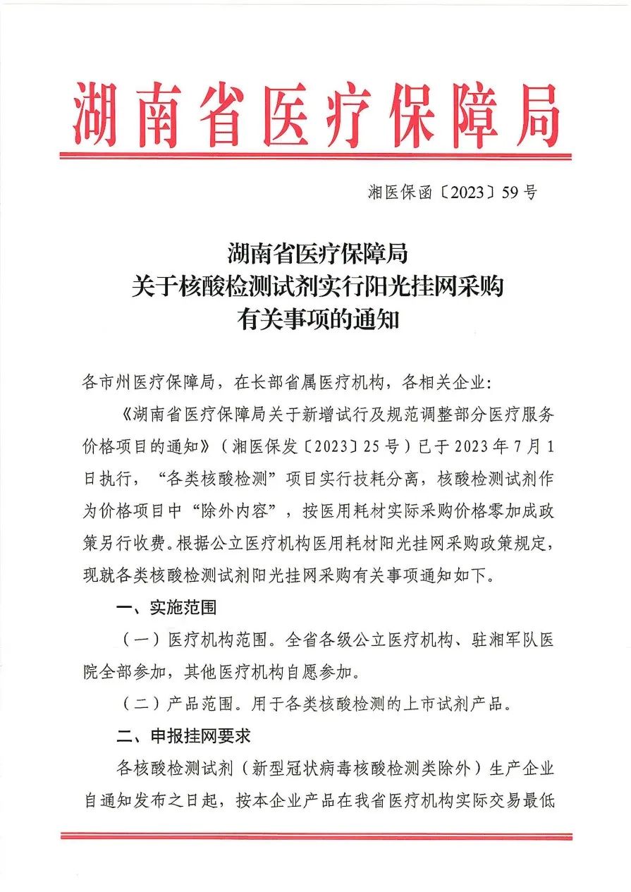 2023年8月16日,湖南省醫(yī)保局發(fā)布《關(guān)于核酸檢測試劑實(shí)行陽光掛網(wǎng)采購有關(guān)事項(xiàng)的通知》,要求相關(guān)生產(chǎn)企業(yè)將用于各類核酸檢測的上市試劑產(chǎn)品(新型冠狀病毒核酸檢測類除外)于2023年9月10日前,以湖南省醫(yī)療機(jī)構(gòu)實(shí)際交易最低價(jià)在湖南醫(yī)保招采管理系統(tǒng)申報(bào)掛網(wǎng)。